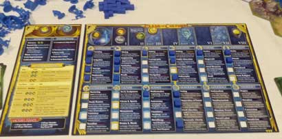 Two things really make the game. The first is the technology development. Each player has a separate board (see right – I was playing blue) to track their technology in a dozen different areas. Each of these provides players with advantages (and some disadvantages) that help them develop their ‘culture’ in particular directions. The other thing is the terrific playing pieces. I particularly like the buildings that fit together so that a full set makes a complete city.
