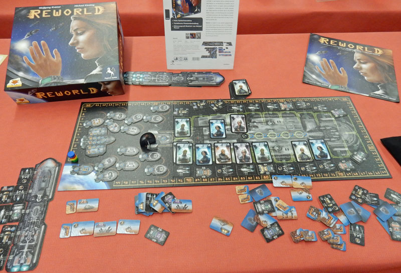 We moved on to try the new game from well-known designer duo Michael Kiesling and Wolfgang Kramer: Reworld, published by eggertspiele. The theme is the settling of a planet in a different solar system and it's a game of two halves. No, really. In the first half (or chapter, as the designers have it) takes place in orbit around Earth as players add modules (tiles) of different types to their 'carrier' spaceship. The second half follows arrival at the new planet with the players landing their modules to build cities to attract settlers. It's a great story even before you play the game!
